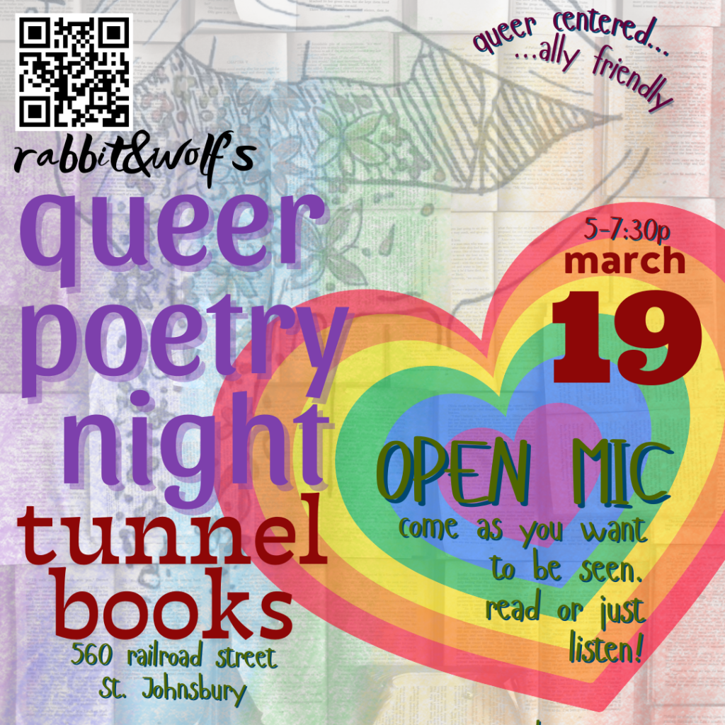 Rabbit & Wolf hosts a night of queer poetry. come as you want to be seen. read or listen. queer centered, ally friendly.