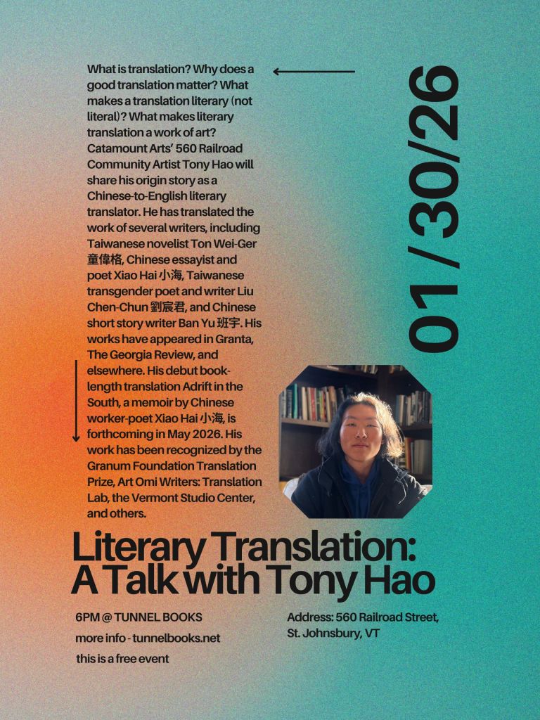 What is translation? Why does a good translation matter? What makes a translation literary (not literal)? What makes literary translation a work of art? Catamount Arts’ 560 Railroad Community Artist Tony Hao will share his origin story as a Chinese-to-English literary translator. He has translated the work of several writers, including Taiwanese novelist Ton Wei-Ger 童偉格, Chinese essayist and poet Xiao Hai 小海, Taiwanese transgender poet and writer Liu Chen-Chun 劉宸君, and Chinese short story writer Ban Yu 班宇. His works have appeared in Granta, The Georgia Review, and elsewhere. His debut book-length translation Adrift in the South, a memoir by Chinese worker-poet Xiao Hai 小海, is forthcoming in May 2026. His work has been recognized by the Granum Foundation Translation Prize, Art Omi Writers: Translation Lab, the Vermont Studio Center, and others.